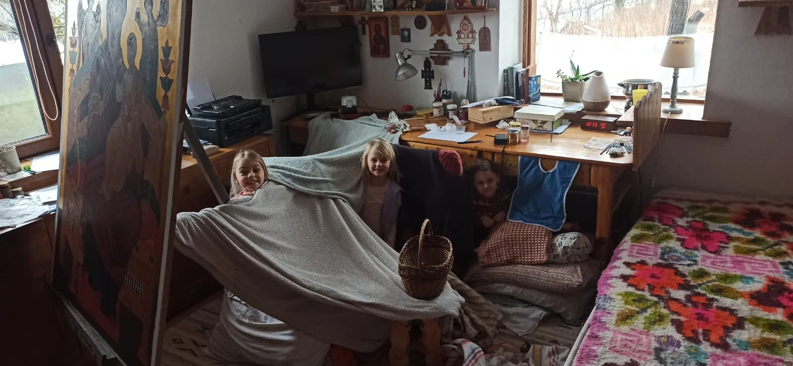Mă lupt cu morile de vânt. În timp ce am strâns din bucătărie cât de cât, camera asta (dormitor, loc de joacă și atelier) a devenit așa. La masa aia trebuie să mă așez acum să pictez. Ce să fac, să le stric vizuinile?