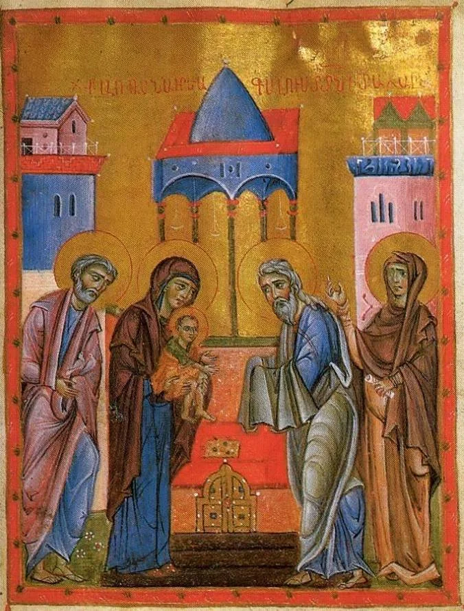 Scena în care Hristos Se oferă pe Sine în templu ca prunc este emoţionantă. Dumnezeul de dinainte de veci, Care, Fiul Celui Preaînalt fiind, era unit în permanenţă cu Tatăl şi cu Duhul Sfânt, Cel ce cuprindea lumea şi întreaga creaţie vine acum în templu ca prunc purtat pe braţele Maicii Sale. Chiar dacă era prunc, Hristos era în acelaşi timp şi „Dumnezeu de dinainte de veci”, purtând în trup plinătatea Dumnezeirii şi toată înţelepciunea şi cunoaşterea umană, datorită unirii firii dumnezeieşti cu cea omenească în ipostasul Cuvântului.