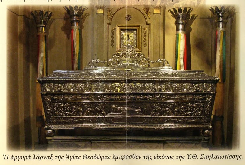 Moaștele sfintei au fost aflate neputrezite și s-au păstrat în Constantinopol vreme de șase veacuri. Apoi, la trei ani după căderea Constantinopolului, în 1456, moaștele Sfântului Spiridon și ale Sfintei Teodora Împărăteasa au fost mutate în taină din Constantinopol în Corfu. Astăzi, moaștele Sfintei Teodora Împărăteasa sunt așezate spre închinare în Catedrala Panaghia Spiliotissa din Corfu.