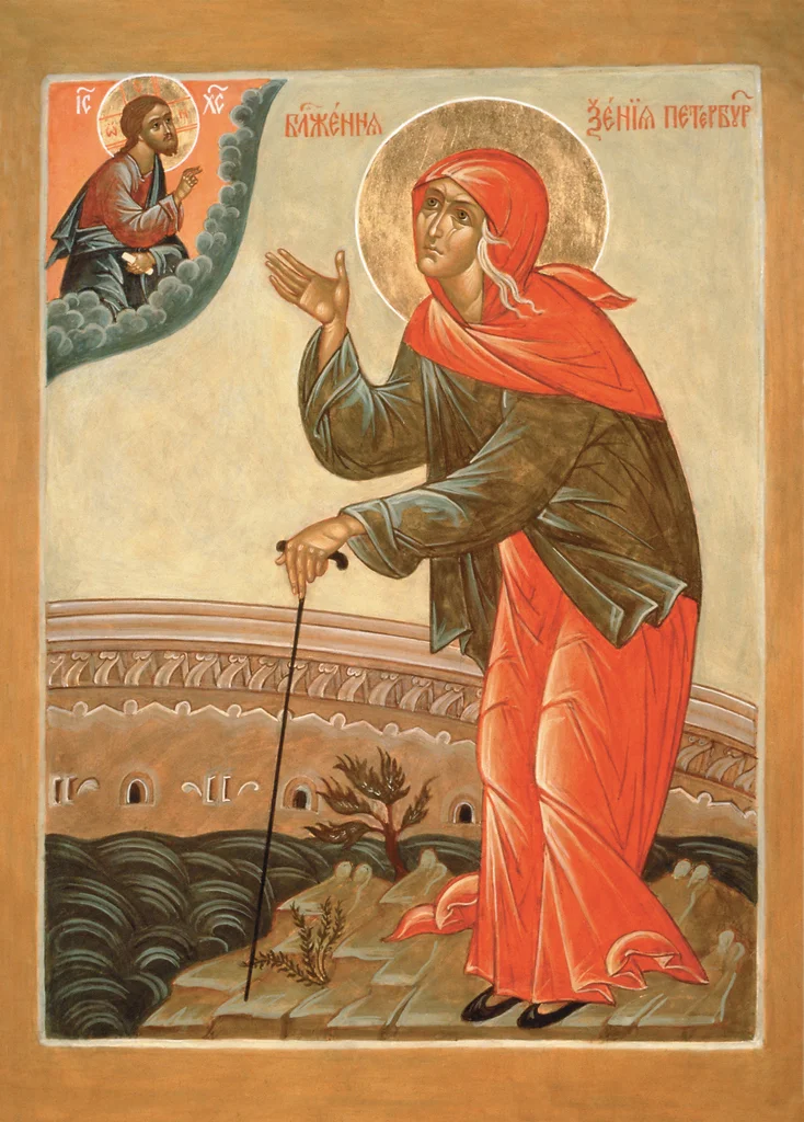 Spre uimirea și totala dezaprobare a prietenilor, rudelor și cunoscuților, Xenia își vinde bunurile și dăruiește tot ce avea săracilor. Eliberată de povara administrării lor, dispare subit din oraș vreme de aproape opt ani. Se pare că a petrecut acești opt ani într-o obște sihăstrească, învățând cu sete și ardoare despre taina rugăciunii și a trăirii duhovnicești. Apoi, îmbogățită și transfigurată sufletește, s-a întors în Sankt Petersburg, colindând străzile din partea săracă a orașului, dormind și rugându-se pe câmp și sub cerul liber.
