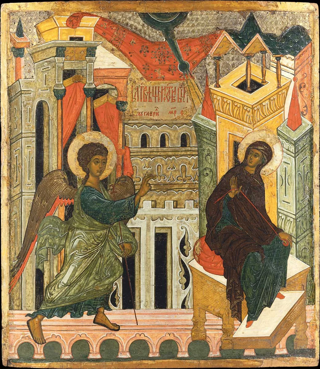 În icoana Bunei Vestiri, Maria ține fusul și firul purpuriu pentru catapeteasma templului. Firul trece prin degete. Casa din Nazaret se umple de lucru. Arhanghelul Gavriil aduce vestea întrupării. În pântecele Fecioarei începe o altă țesere: trupul Fiului. Lucrarea mâinilor pregătește loc pentru har.