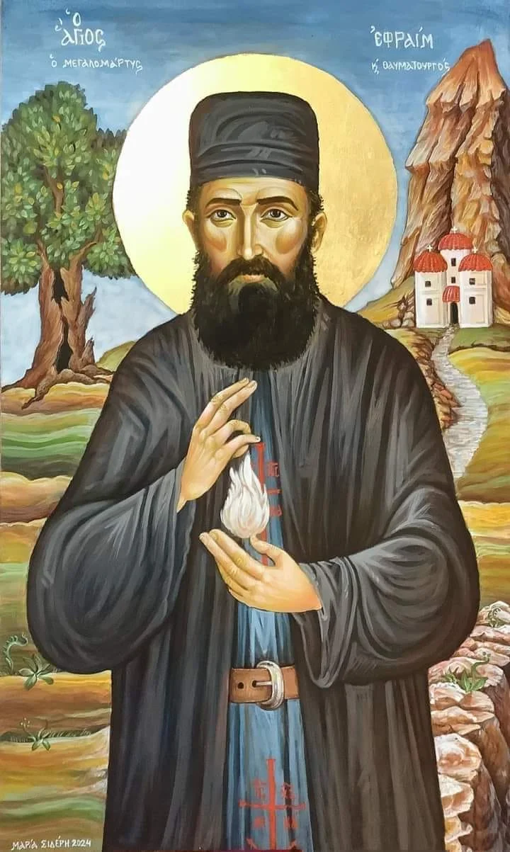 L-am cunoscut pe Sfântul Efrem în anul 2013, la mănăstirea unde mergeam periodic să mă spovedesc: un monah adusese spre închinare o copie a unei icoane izvorâtoare de mir a Sfântului, din Grecia. Se dusese vestea despre această icoană și astfel au început să vină numeroși credincioși să se închine. Așa se face că tot aici, la mănăstire, l-am cunoscut și pe soțul meu.